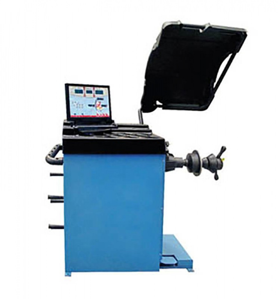 Балансировочный станок (автомат) CB987 с автоматическим вводом 2 параметров колеса (вылет, диаметр диска). Кожух для защиты оператора от грязи. Автоматическая раскрутка и торможение. Педаль тормоза для фиксации колеса в заданном положении.